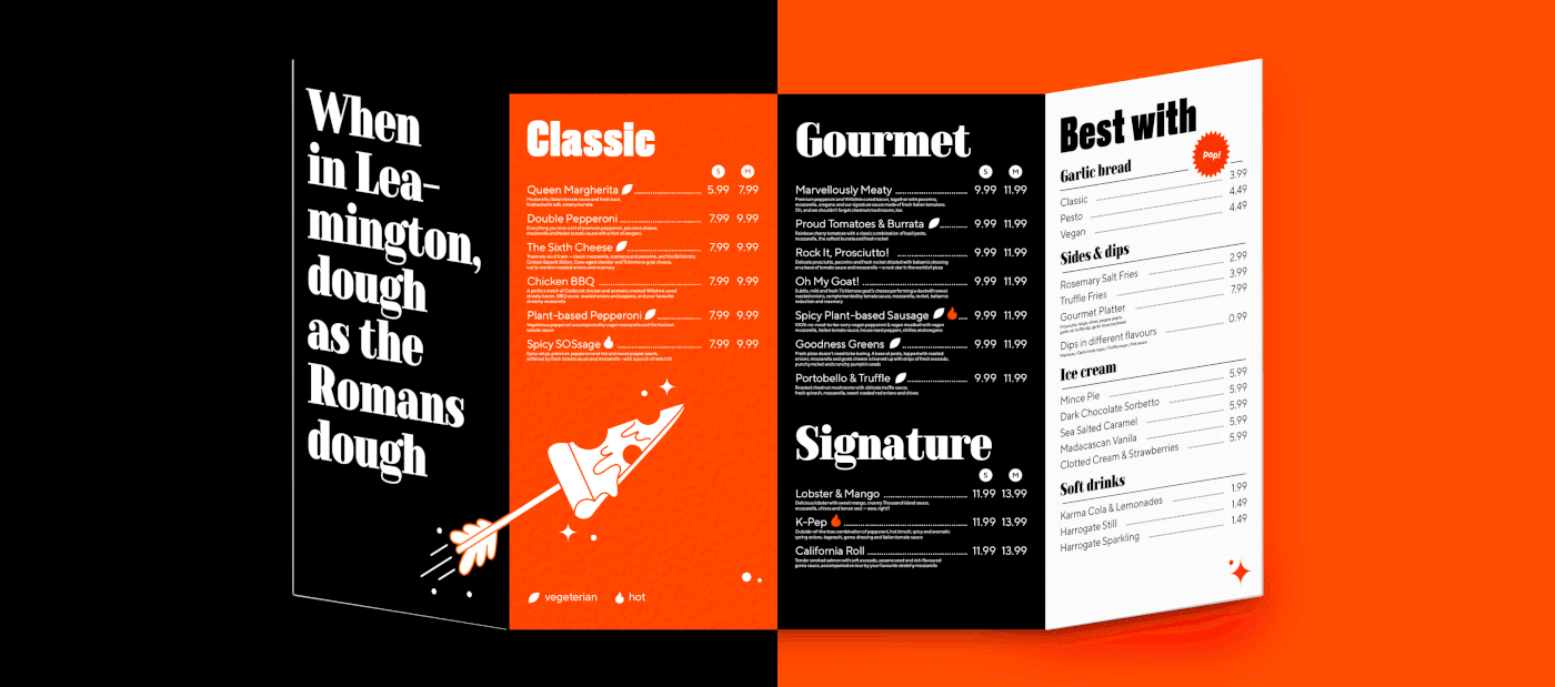 Black meets orange. Antiqua meets grotesque. Engraving meets…Whatever this is. Not only we’ve created a memorable tongue-in-cheek visual style, but we’ve managed to reignite the love for pizza by curating the whole experience. Quirky naming? Check. Awesome merch? Check. Stylish menus? Check. Tons of silly jokes? Double check.