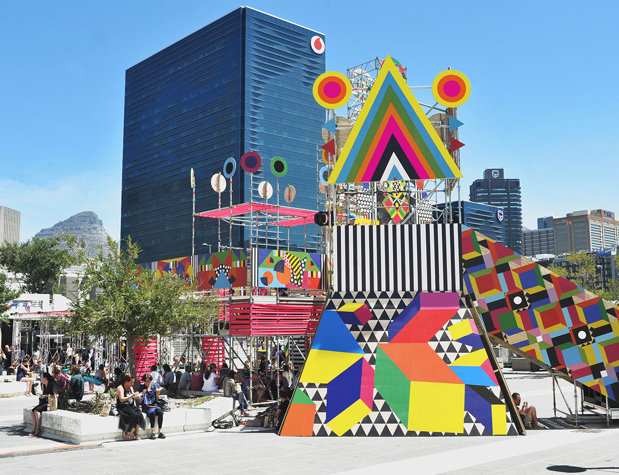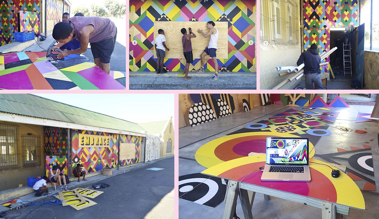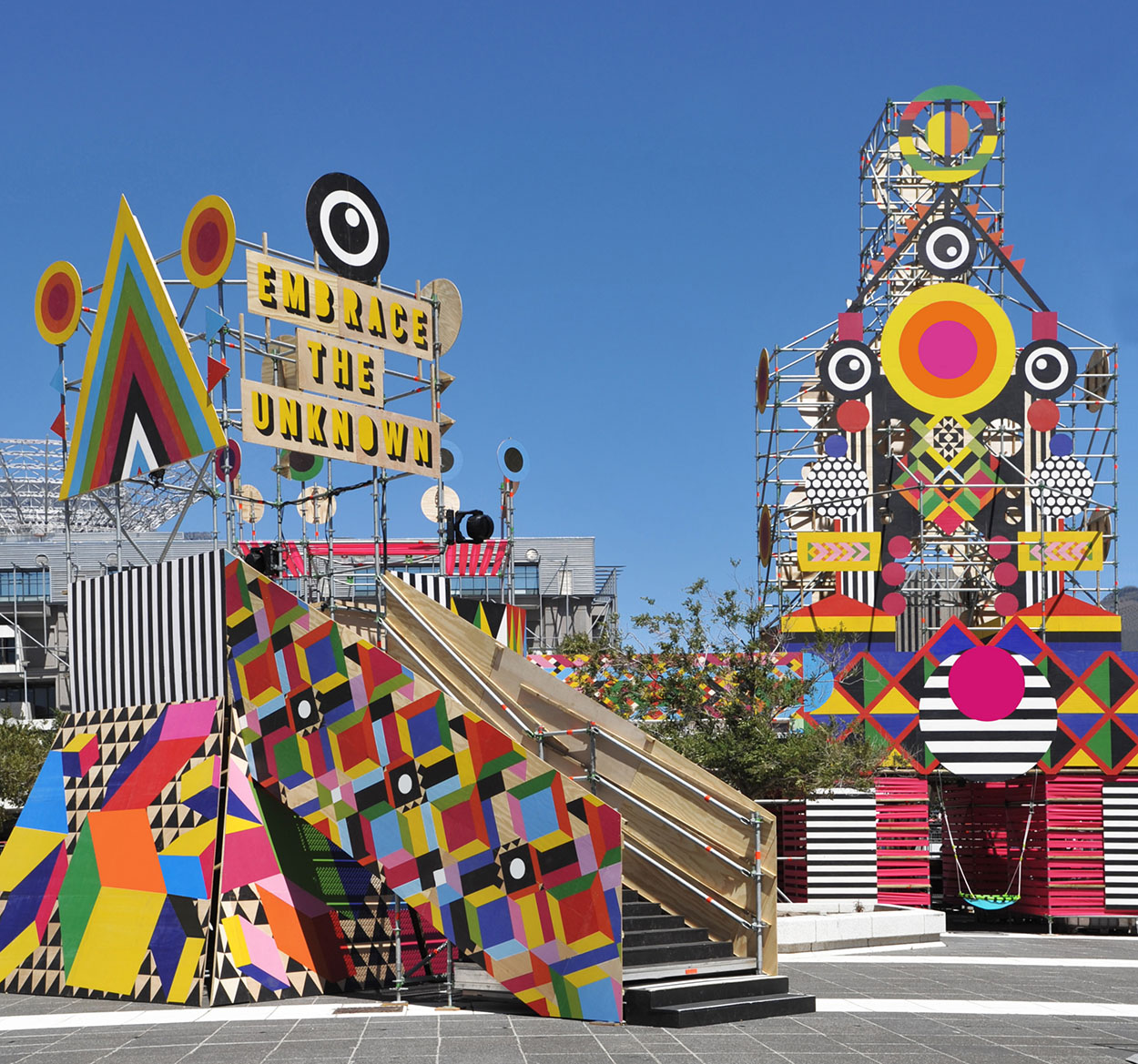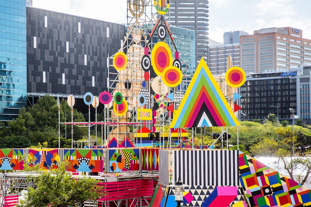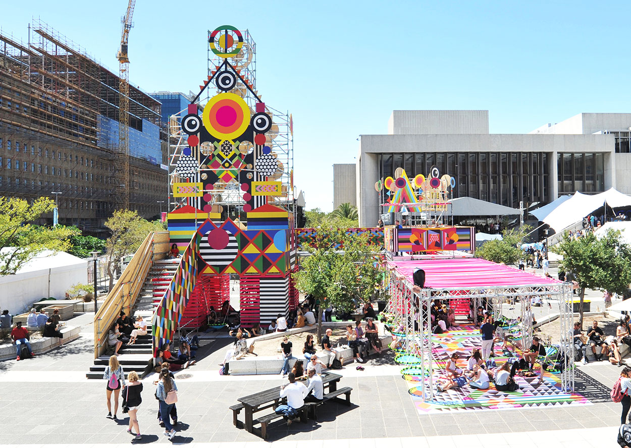 “Embrace the Unknown, was a direct response to the concrete architecture of the Artscape Theatre Piazza and the conference audience. When people attend conferences, they arrive, sit and intensely listen. In between events a place to release energy, chat and relax is much needed” explains Morag. It made sense to take a square that is very nearly all concrete directly outside the theatre would be transformed into a playground.”