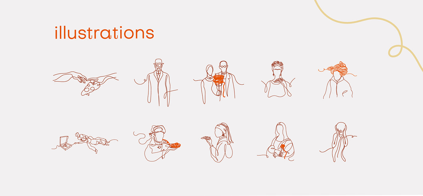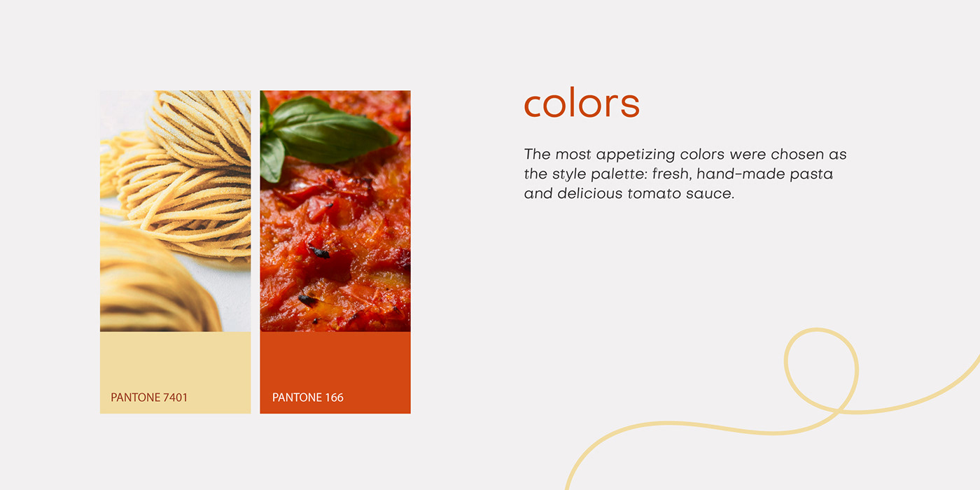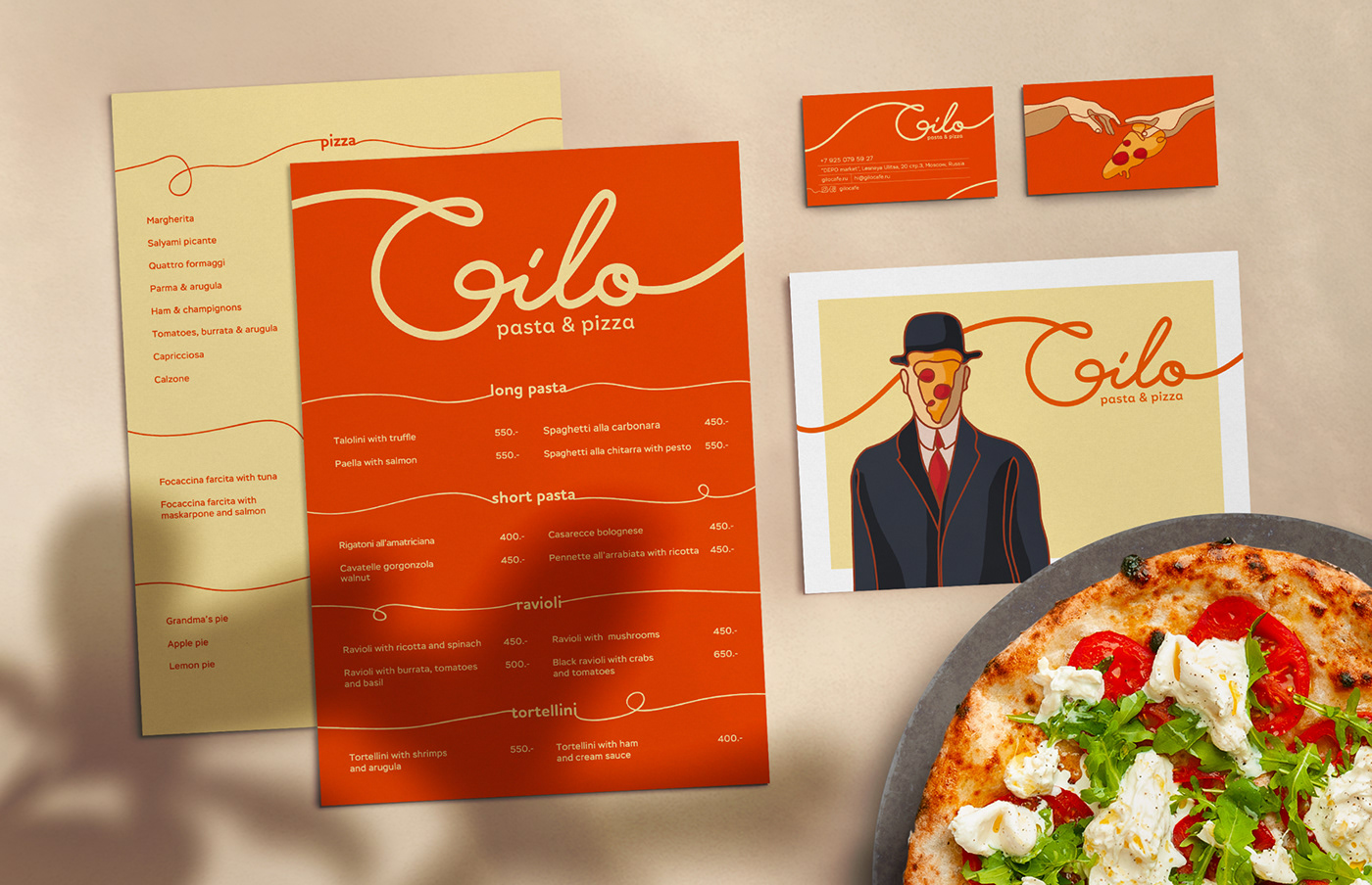 The goal was to create a place of attraction with its own special atmosphere and the bright character of Italy, which will stand out from the competition. Thus, the visual identity for this restaurant is based on the fusion of two spheres of delight and admiration: italian gastronomy and painting.