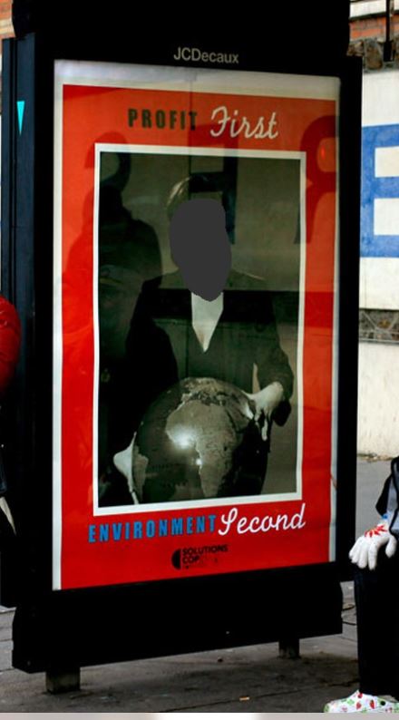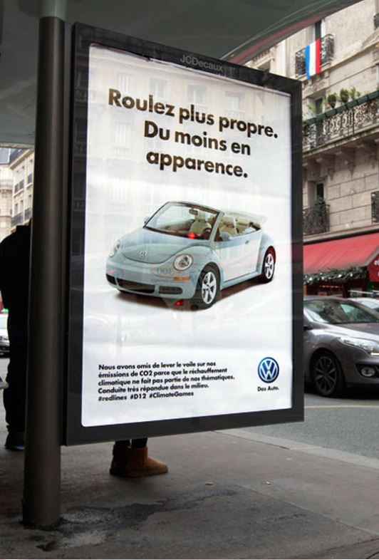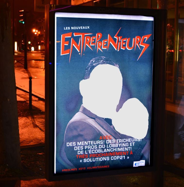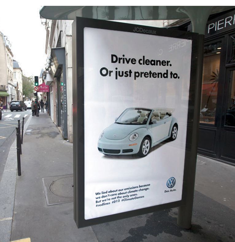In collaboration with UK group Brandalism, 600 ad spaces at bus stops in Paris were hijacked. ‘Official’ adverts for brands including Total, Mobil and Volkswagen were replaced with fake ones criticising the companies’ environmental credentials.